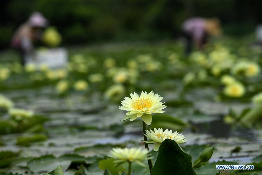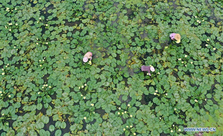 Villagers harvest lotus flowers at Xiatao Village of Shibeiping Town, Liuzhou city, south China's Guangxi Zhuang Autonomous Region, Aug. 5, 2020. In recent years, the production of lotus flower tea has become a new way for local villagers to increase incomes. (Photo by Li Hanchi/Xinhua)