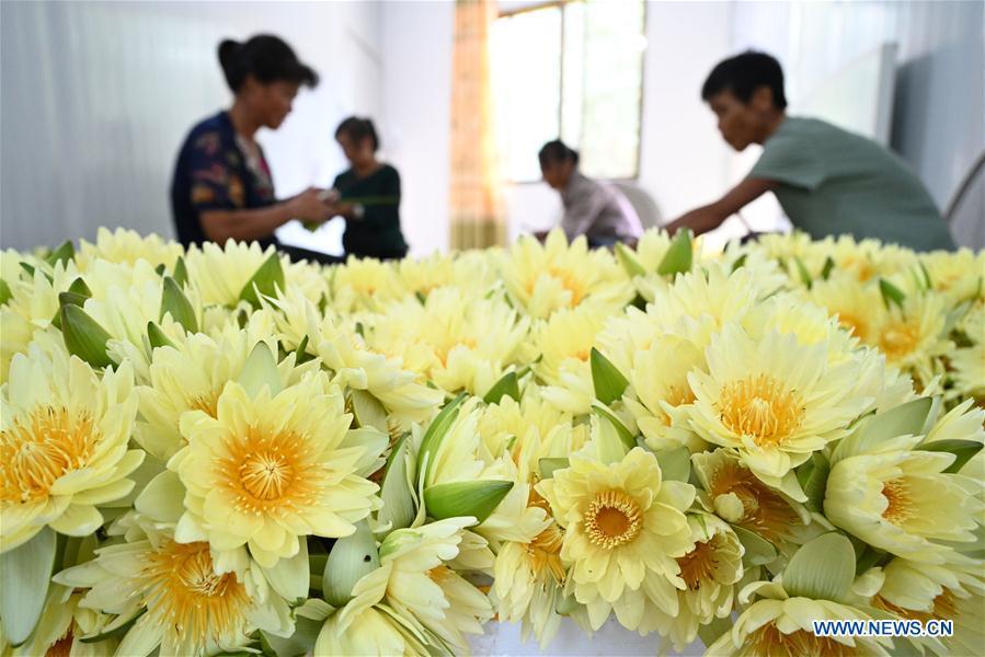 Villagers trim newly-harvested lotus flowers at Xiatao Village of Shibeiping Town, Liuzhou city, south China's Guangxi Zhuang Autonomous Region, Aug. 5, 2020. In recent years, the production of lotus flower tea has become a new way for local villagers to increase incomes. (Photo by Li Hanchi/Xinhua)