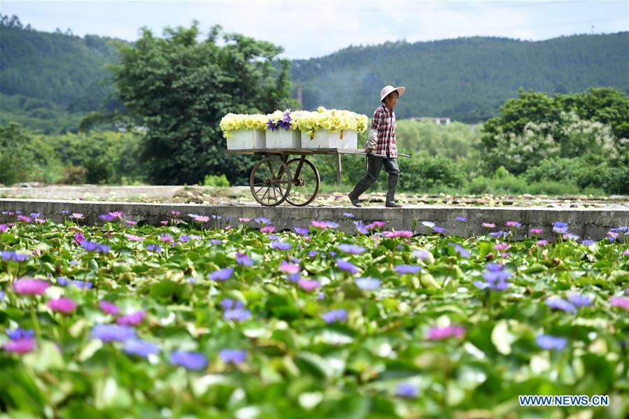 A villager transports newly-harvested lotus flowers at Xiatao Village of Shibeiping Town, Liuzhou city, south China's Guangxi Zhuang Autonomous Region, Aug. 5, 2020. In recent years, the production of lotus flower tea has become a new way for local villagers to increase incomes. (Photo by Li Hanchi/Xinhua)