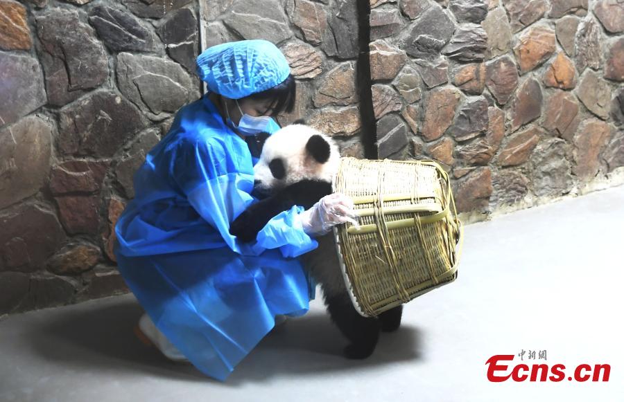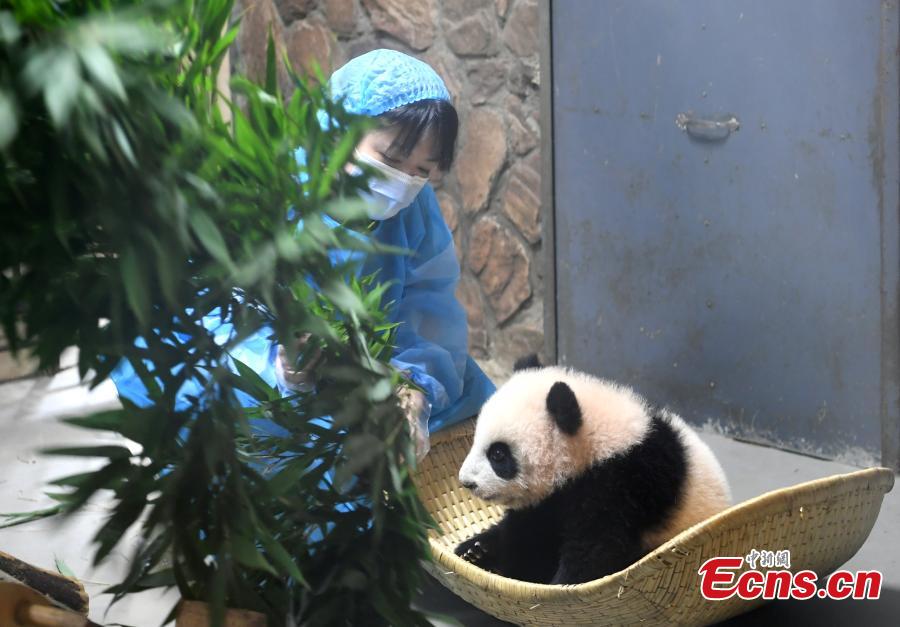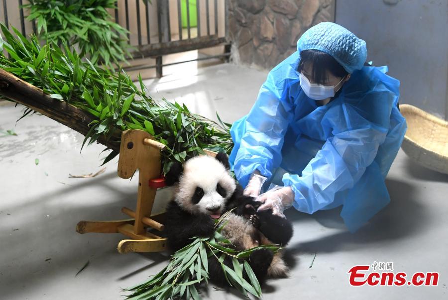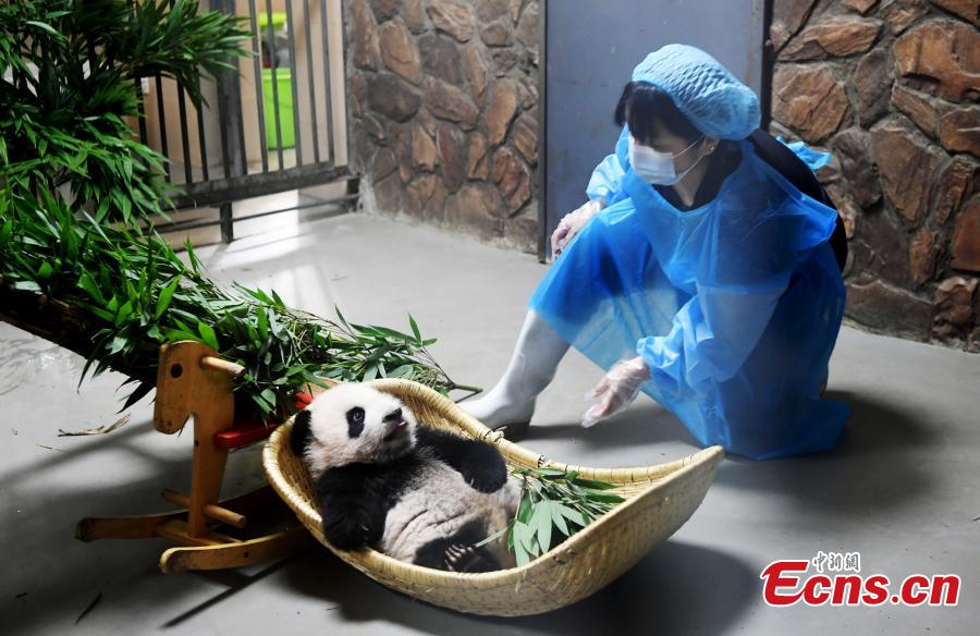 Abe Nobuko, a 35-year-old panda breeder from Japan takes care of five-month-old panda cub Chunsheng at the Chengdu Research Base of Giant Panda Breeding in Chengdu, Southwest China's Sichuan province on August 13, 2020. (Photo: China News Service/An Yuan)
