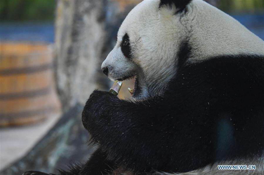 Giant panda Shunshun enjoys food at Hainan Tropical Wildlife Park and Botanical Garden in Haikou, south China's Hainan Province, Aug. 27, 2020. The park held celebrations for the seventh birthday of two giant pandas on Thursday. (Xinhua/Pu Xiaoxu)