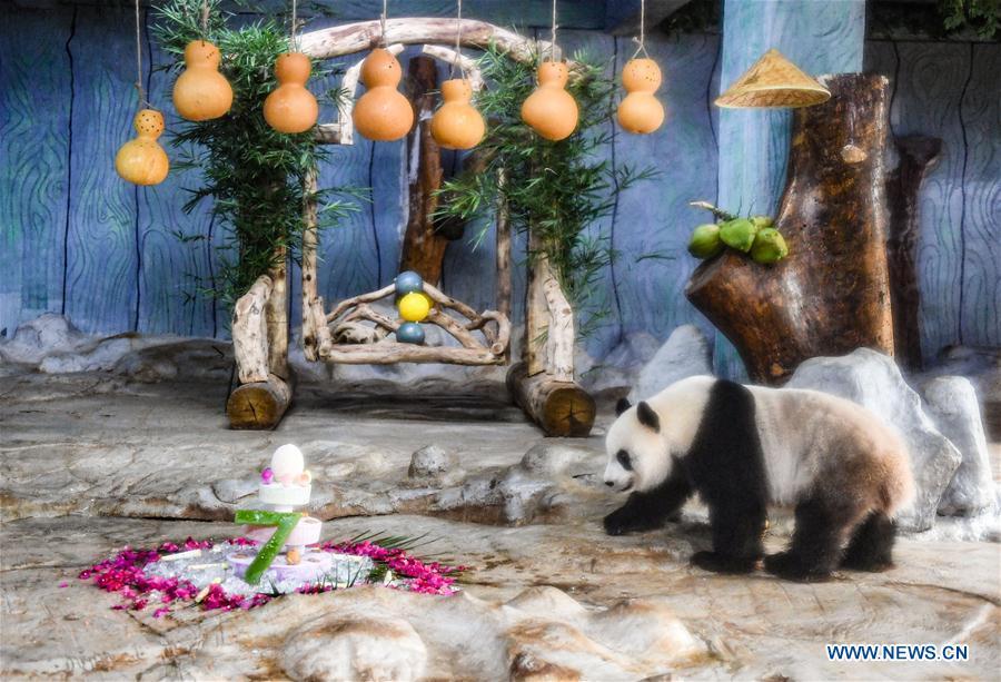 Giant panda Gonggong prepares to enjoy food at Hainan Tropical Wildlife Park and Botanical Garden in Haikou, south China's Hainan Province, Aug. 27, 2020. The park held celebrations for the seventh birthday of two giant pandas on Thursday. (Xinhua/Pu Xiaoxu)
