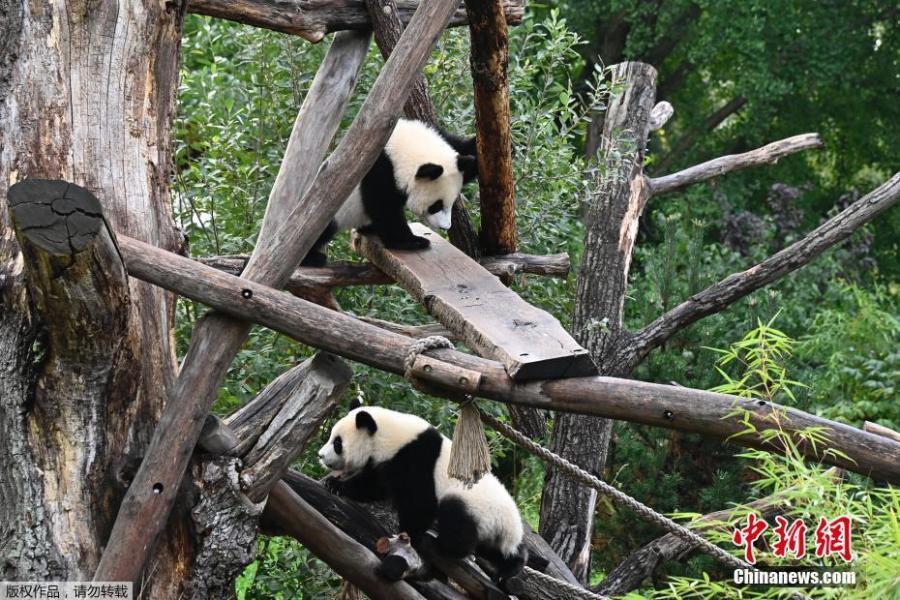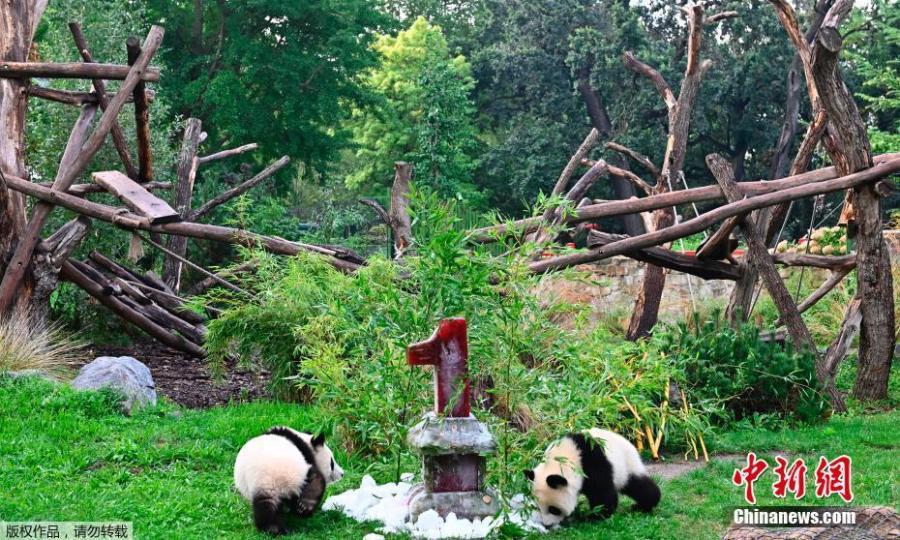 Giant panda twins Meng Xiang and Meng Yuan are seen at Berlin Zoo in Berlin, capital of Germany, Aug. 31, 2020. The giant panda twins Meng Xiang and Meng Yuan, which were the first-ever twin giant pandas born in Germany, celebrated their first birthday at the zoo on Monday. (Photo/Agencies)