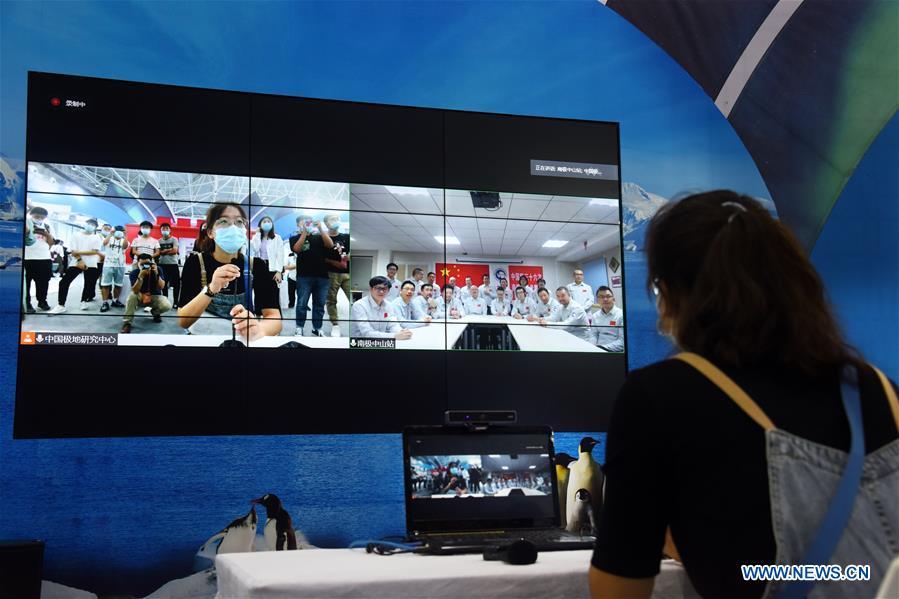 A visitor talks with researchers in China's Zhongshan Station in Antarctica via video during the 2020 East Asia Marine Expo in Qingdao, east China's Shandong Province, Sept. 22, 2020. The 2020 East Asia Marine Expo opened Tuesday in Qingdao, a coastal city of east China's Shandong Province, convening more than 770 companies and institutes from over 70 countries and regions. More than 50,000 different exhibits ranging from ocean engineering, offshore oil and gas exploration, seabed exploration, deep-sea aquaculture and scientific research equipment, to scientific achievements in marine surveying and mapping as well as fishery products have been put on show at the six-day expo, which boasts 60,000 square meters of exhibition area. (Xinhua/Li Ziheng)