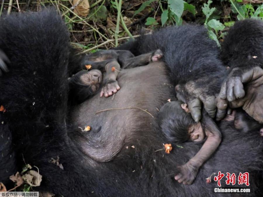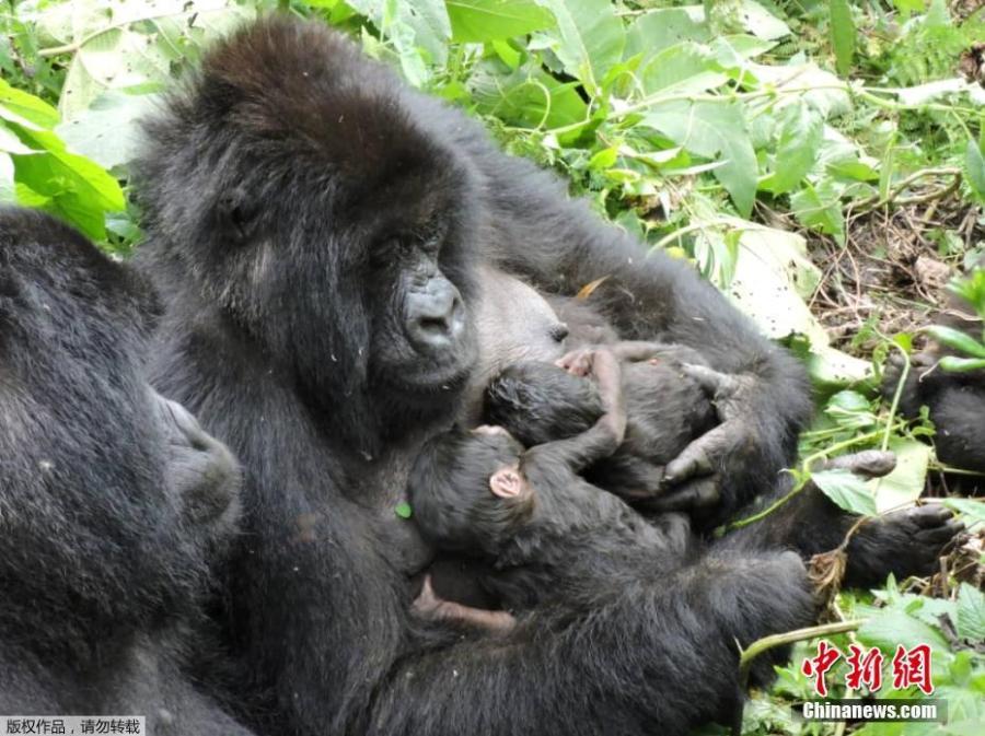 A gorilla holds her newly born twin babies at the Virunga National Park in the Democratic Republic of Congo in this picture released on September 22, 2020. (Photo/Agencies)