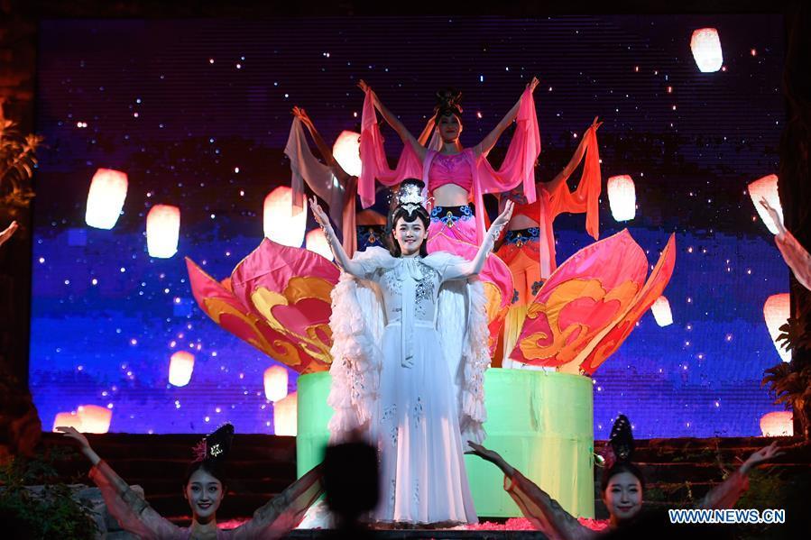 Actresses perform at a scenic spot in Hangzhou City, east China's Zhejiang Province, Sept. 26, 2020. A lantern-themed event kicked off at the scenic spot, with various lantern related activities and performances unveiled to tourists. (Xinhua/Huang Zongzhi)