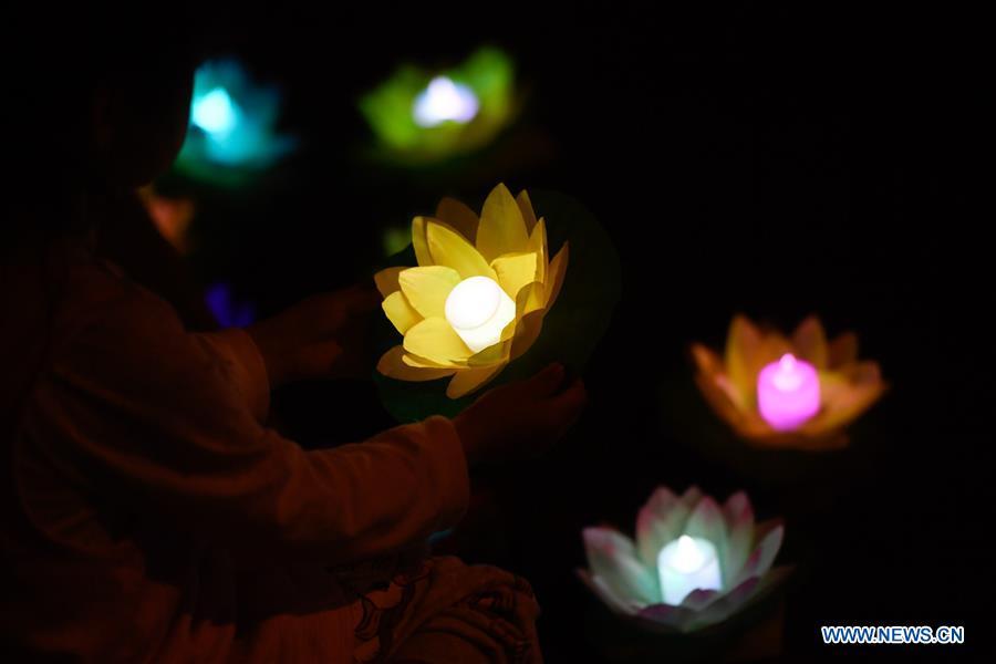A girl releases a water lantern at a scenic spot in Hangzhou City, east China's Zhejiang Province, Sept. 26, 2020. A lantern-themed event kicked off at the scenic spot, with various lantern related activities and performances unveiled to tourists. (Xinhua/Huang Zongzhi)