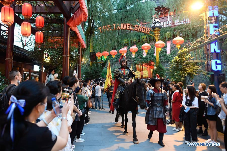 Tourists watch performances at a scenic spot in Hangzhou City, east China's Zhejiang Province, Sept. 26, 2020. A lantern-themed event kicked off at the scenic spot, with various lantern related activities and performances unveiled to tourists. (Xinhua/Huang Zongzhi)