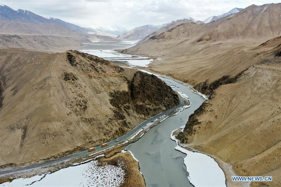 Aerial photo taken on March 24, 2020 shows school buses running on a road to Akto County, northwest China's Xinjiang Uygur Autonomous Region. Xinjiang has invested 397.3 billion yuan (around 58.3 billion U.S. dollars) between 2014 and 2019 in road construction, local authorities said. This was 1.53 times the total investment in road construction in Xinjiang between 1949 and 2013, said the regional transport department. (Xinhua/Ding Lei)