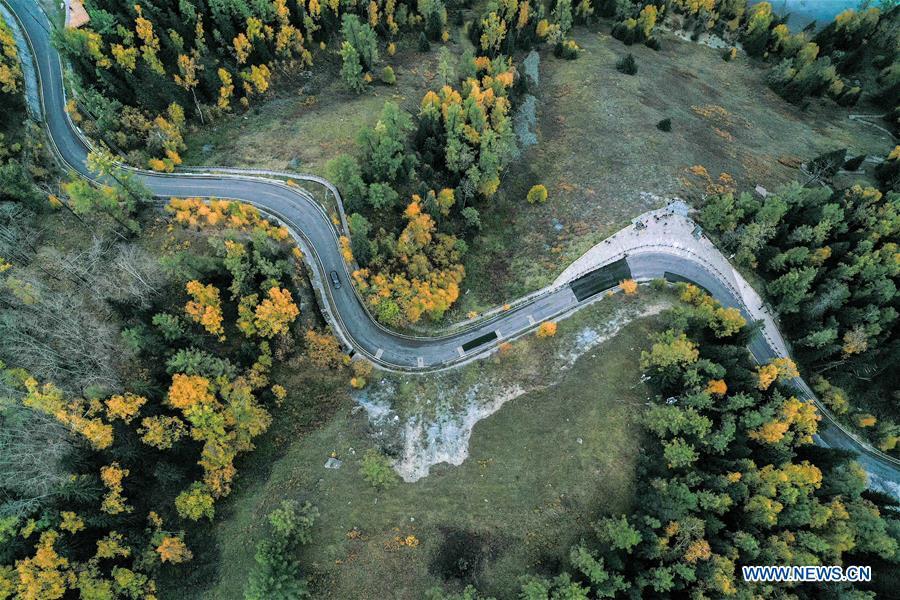 Aerial photo taken on Sept. 18, 2020 shows a winding road in Kanas scenic area, northwest China's Xinjiang Uygur Autonomous Region. Xinjiang has invested 397.3 billion yuan (around 58.3 billion U.S. dollars) between 2014 and 2019 in road construction, local authorities said. This was 1.53 times the total investment in road construction in Xinjiang between 1949 and 2013, said the regional transport department. (Xinhua/Ding Lei)