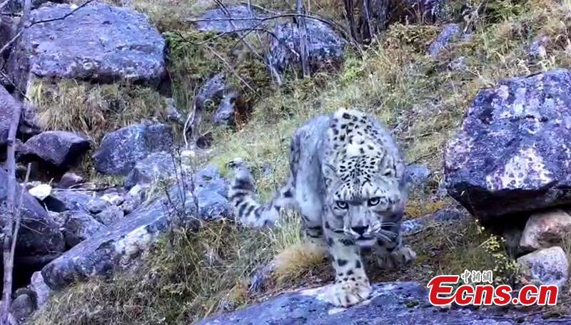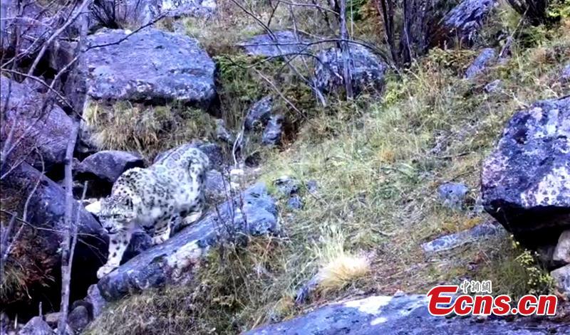 A snow leopard is caught on camera in the Geyen Mountain scenic area, Litang County of Ganzi Tibetan Autonomous Prefecture in southwest China's Sichuan Province, Nov. 15, 2020. (Screenshot Photo)