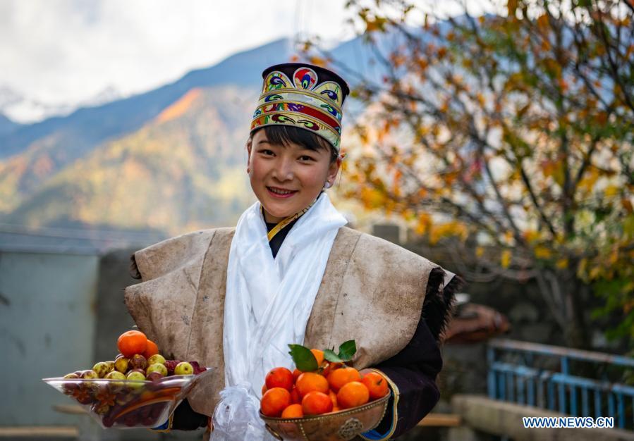 A villager celebrates the special New Year, known as the Gongbo New Year in Baji Village of Bayi District in Nyingchi, southwest China's Tibet Autonomous Region, Nov. 18, 2020. The local people follow the tradition to celebrate the Gongbo New Year on Oct. 1 by the Tibetan calendar, which fell on Nov. 16 this year. On the morning of Gongbo New Year's day, each Tibetan family worships the goddess of the harvest, with gifts and wine. They also sing and dance during the ritual. According to a local legend, the tradition comes from an event in ancient times when a Tibetan ruler recruited the Gongbo tribe of the Nyingchi area to fight his enemies. The ruler brought the New Year's Day forward to Oct. 1, and ordered the soldiers to have a good celebration on the eve of the war so as to arouse their morale. This custom has been handed down since then. (Xinhua/Purbu Zhaxi)