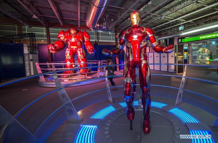An Iron Man suit (Front) is seen at the exhibition Marvel Avengers S.T.A.T.I.O.N. during the media preview at Yorkdale Shopping Center in Toronto, Canada, on Nov. 19, 2020. Featuring the Marvel Cinematic Universe of superheroes, the exhibition will open to the public from Nov. 20, 2020 to Jan. 31, 2021. (Photo by Zou Zheng/Xinhua)