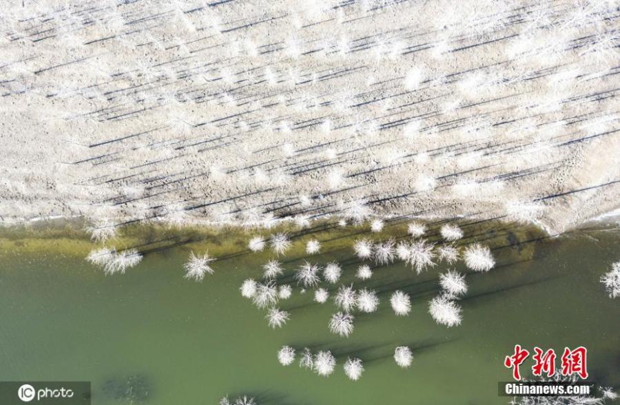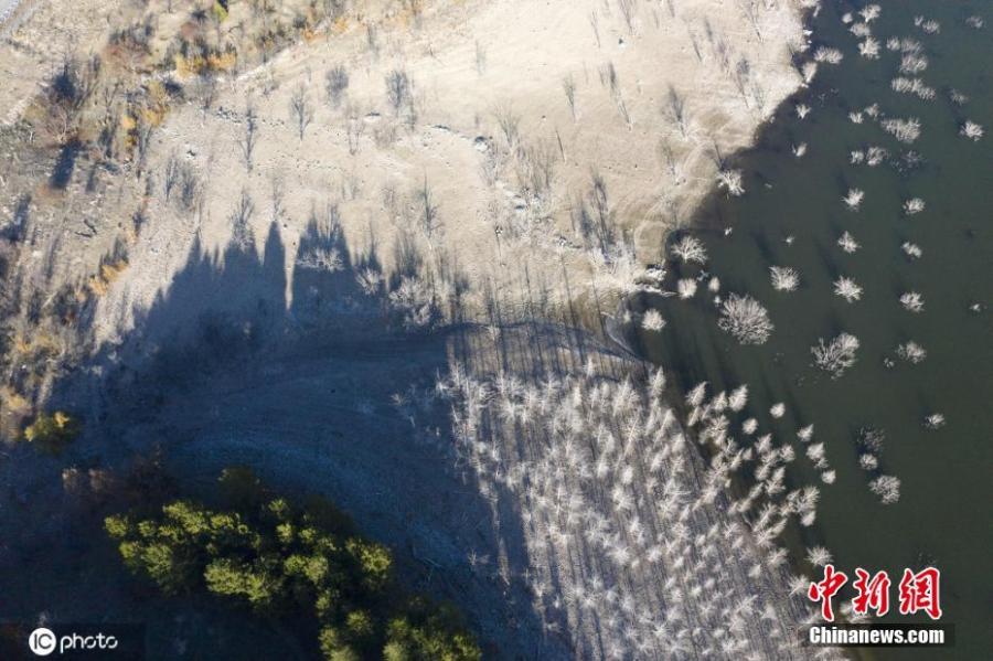 Aerial view photo taken on Nov. 23, 2020 shows the sprarkling rime-covered trees around Ozcayi Dam during the season in Ankara, Turkey. (Photo/ICphoto)