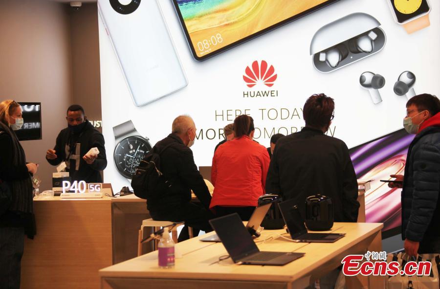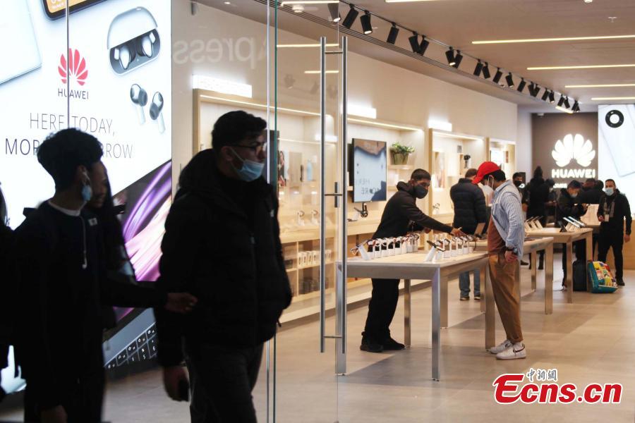 Customers pick items at Huawei's first flagship store in the UK, which is located in Westfield Stratford City, East London, Dec 15, 2020. The store is the first of three long-term leases planned for various locations across the UK for Huawei. A wide variety of products ranging from its smartphones to its “extensive range” of wearable, hearables, tablets and PC products are for sale. (China News Service/Zhang ping)