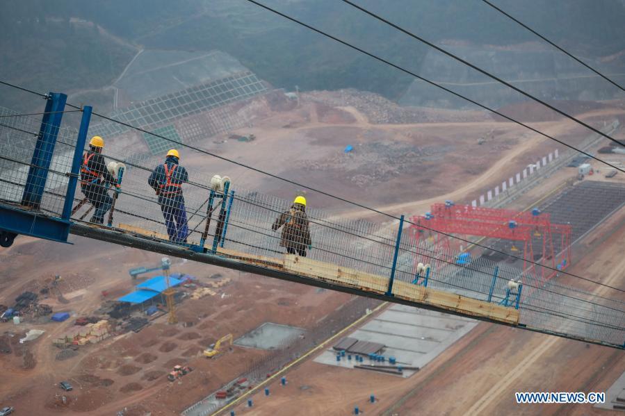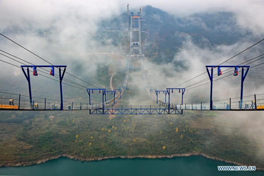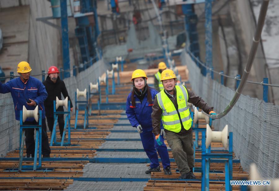 Workers install the main cables on the Kaizhou Lake grand bridge in southwest China's Guizhou Province, Jan. 5, 2021. The Kaizhou Lake grand bridge is part of the Weng'an-Kaiyang expressway. With a main span of 1,100 meters, the bridge is 1,257 meters in length and one of its main towers is 139 meters in height. (Xinhua/Liu Xu)
