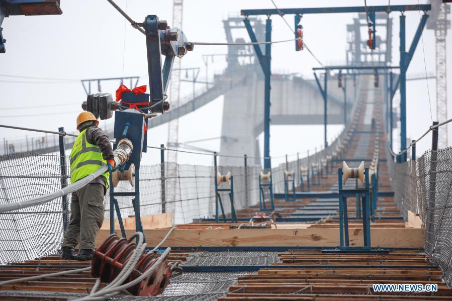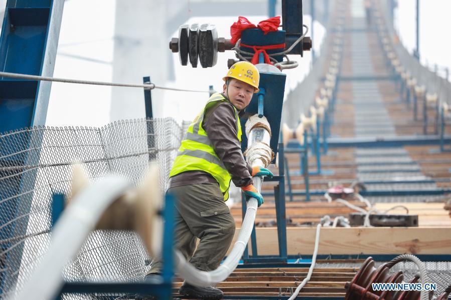 A worker installs the main cables on the Kaizhou Lake grand bridge in southwest China's Guizhou Province, Jan. 5, 2021. The Kaizhou Lake grand bridge is part of the Weng'an-Kaiyang expressway. With a main span of 1,100 meters, the bridge is 1,257 meters in length and one of its main towers is 139 meters in height. (Xinhua/Liu Xu)