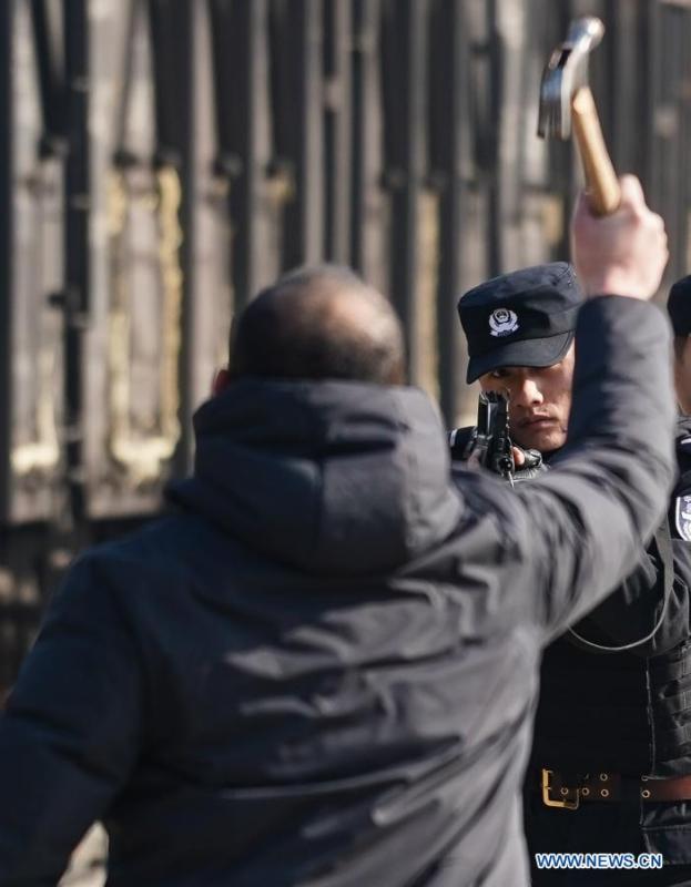 A police officer confronts a "criminal" during a joint railroad police emergency drill at a freight hub in Nanjing, east China's Jiangsu Province, Jan. 19, 2021. (Xinhua/Ji Chunpeng)