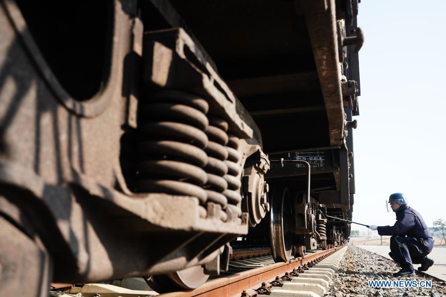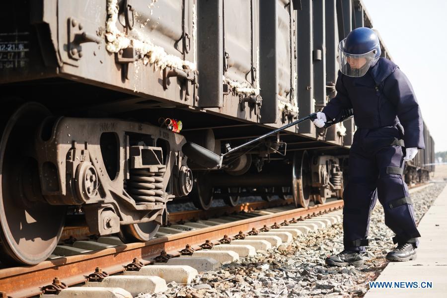 A bomb disposal team member detects "explosive" during a joint railroad police emergency drill at a freight hub in Nanjing, east China's Jiangsu Province, Jan. 19, 2021. (Xinhua/Ji Chunpeng)