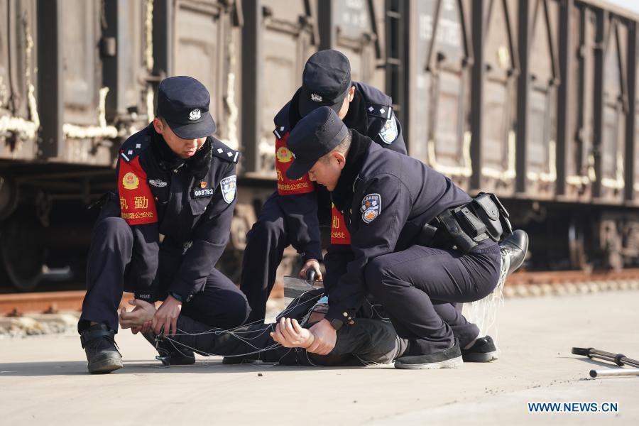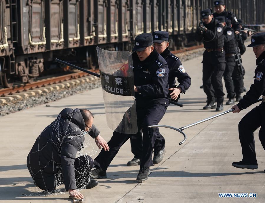 Police officers take part in a joint railroad police emergency drill at a freight hub in Nanjing, east China's Jiangsu Province, Jan. 19, 2021. (Xinhua/Ji Chunpeng)