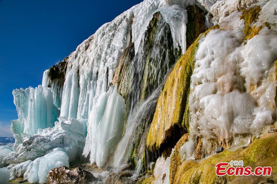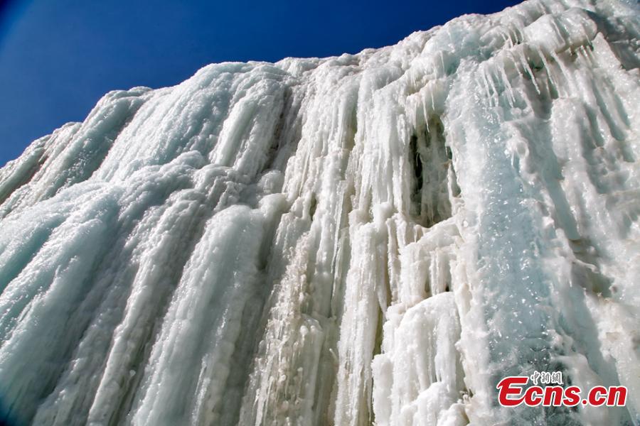 The icefall at the foot of Gangshika Peak in the Qilian Mountain National Park, the junction of Northwest China’s Qinghai Province and Gansu Province, shows colorful landscape in the sunshine on Jan. 23, 2021. (Photo: China News Service/Cheng Lin)