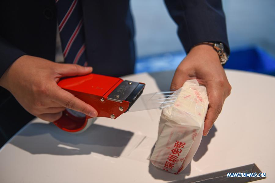 A staff member packs a piece of offshore duty-free good at a duty-free shopping mall in Haikou, south China's Hainan Province, Feb. 14, 2021. Offshore duty-free sales in China's island province of Hainan reached 997 million yuan (about 154.4 million U.S. dollars) during the 2021 Spring Festival holiday, an increase of 261 percent year on year, according to the data from Haikou Customs. (Xinhua/Pu Xiaoxu)