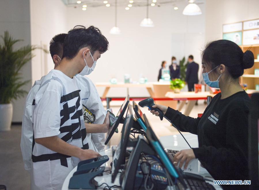 Customers pay for the offshore duty-free products at a duty-free shopping mall in Haikou, south China's Hainan Province, Feb. 14, 2021. Offshore duty-free sales in China's island province of Hainan reached 997 million yuan (about 154.4 million U.S. dollars) during the 2021 Spring Festival holiday, an increase of 261 percent year on year, according to the data from Haikou Customs. (Xinhua/Pu Xiaoxu)