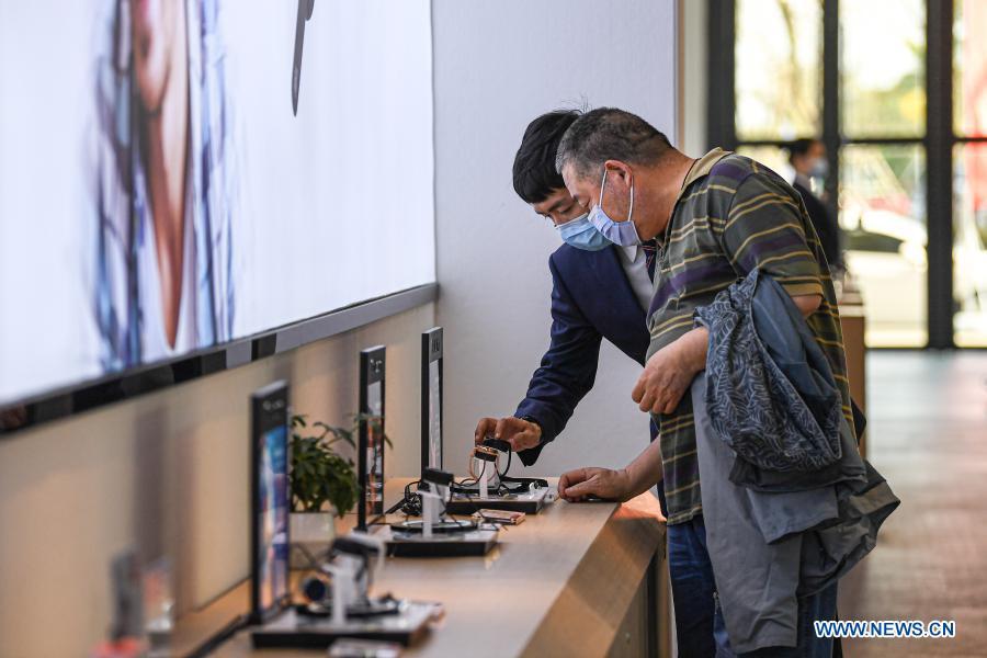 A customer (R) chooses offshore duty-free products at a duty-free shopping mall in Haikou, south China's Hainan Province, Feb. 14, 2021. Offshore duty-free sales in China's island province of Hainan reached 997 million yuan (about 154.4 million U.S. dollars) during the 2021 Spring Festival holiday, an increase of 261 percent year on year, according to the data from Haikou Customs. (Xinhua/Pu Xiaoxu)