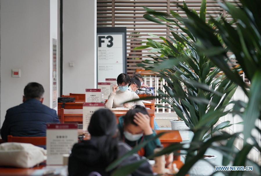 People read at Hebei Provincial Library in Shijiazhuang, north China's Hebei Province, Feb. 22, 2021. Public cultural venues and stadiums in the northern Chinese city of Shijiazhuang, hit by a recent COVID-19 resurgence, resumed operation on Monday. Shijiazhuang cleared all medium- and high-risk areas for COVID-19 on Monday. (Xinhua/Mu Yu)