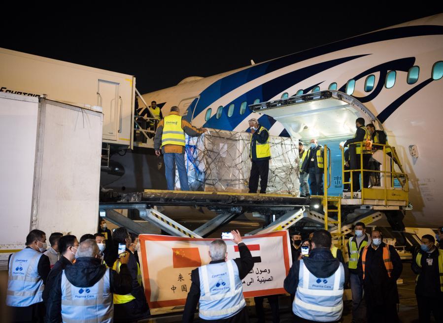 Workers upload a batch of China's Sinopharm COVID-19 vaccines onto a truck in Cairo International Airport, Egypt, Feb. 23, 2021. The shipment of COVID-19 vaccines from Chinese company Sinopharm arrived in Egyptian capital Cairo on Tuesday. (Xinhua/Wu Huiwo)