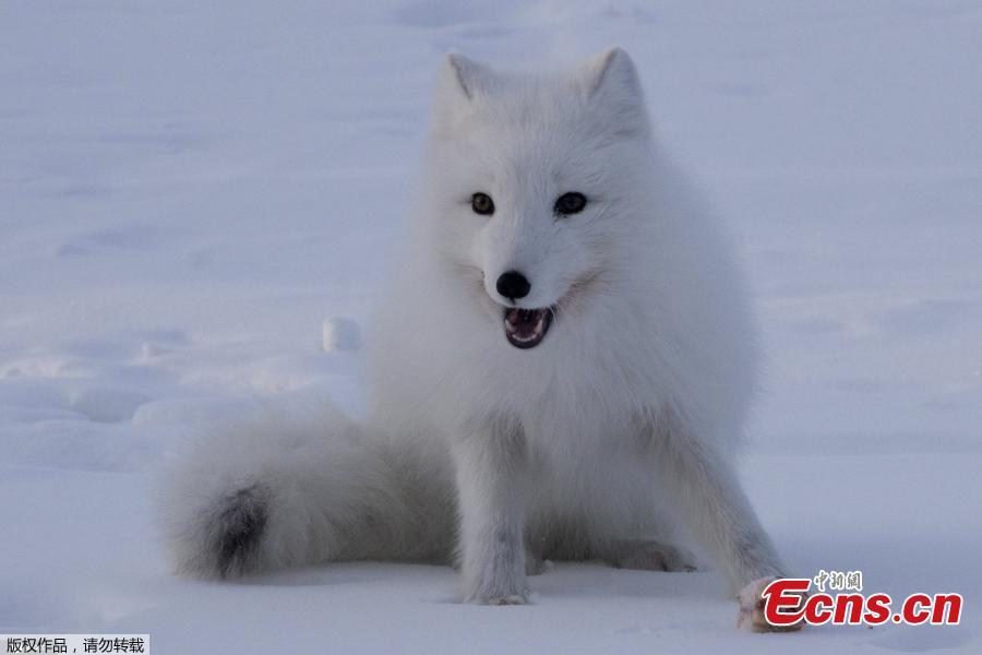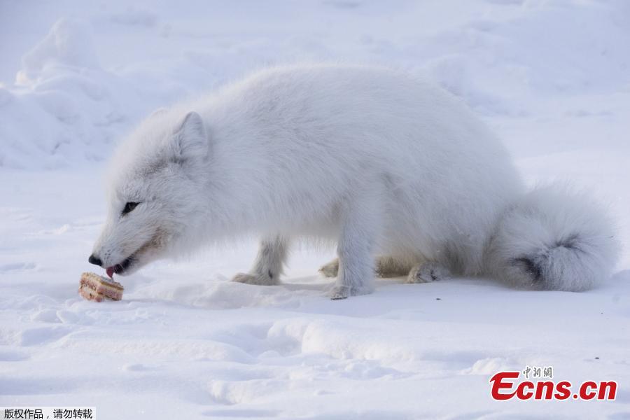 An arctic fox, also known as polar and white fox of Vorkuta, eats a piece of cake thrown by passengers of Khorota railway station as wild animals suffer from hunger due to extreme weather condition in Vorkuta, Komi Repbulic, Russia on March 8, 2021. (Photo/Agencies)