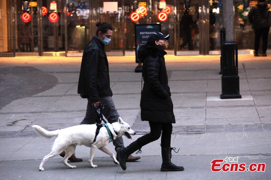People walks their dog in Toronto, Canada, on March 8, 2021. A stay-at-home order in Toronto, Peel Region, and North Bay was lifted Monday as the province loosens pandemic restrictions. The three regions were the last ones still under the order, and are transitioning back to the government's color-coded pandemic response framework. (Photo/Chiona News Service)