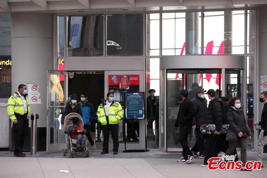 People wearing face masks enter a store in Toronto, Canada, on March 8, 2021. A stay-at-home order in Toronto, Peel Region, and North Bay was lifted Monday as the province loosens pandemic restrictions. The three regions were the last ones still under the order, and are transitioning back to the government's color-coded pandemic response framework. (Photo/Chiona News Service)