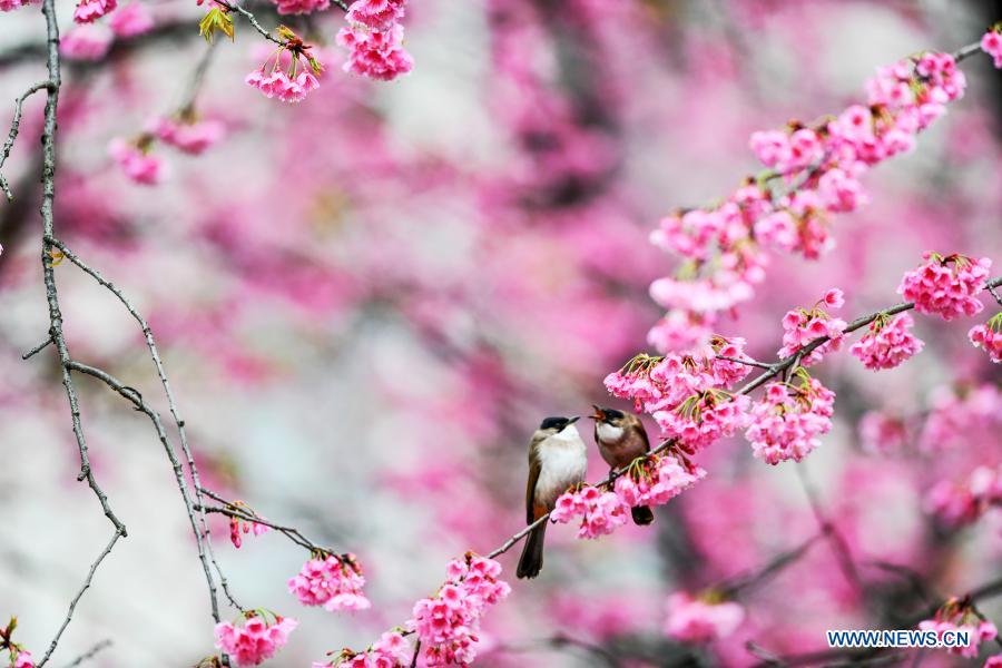 Photo taken on March 9, 2021 shows birds resting on the branch of a blossoming cherry tree in Guiyang, southwest China's Guizhou Province. (Xinhua/Yang Wenbin)
