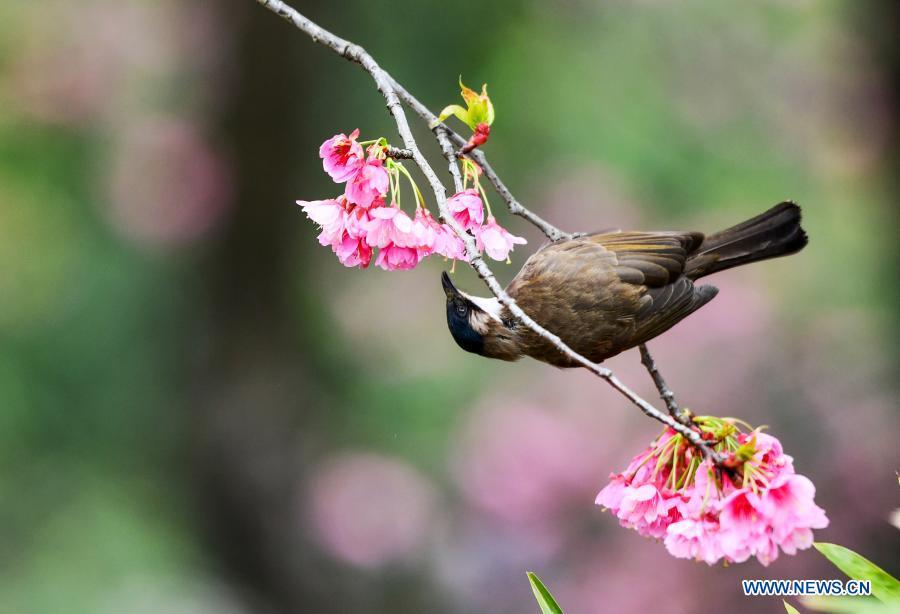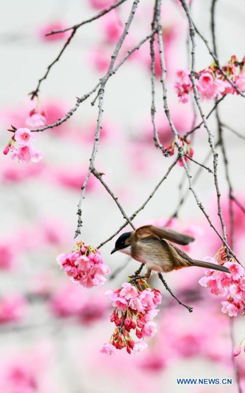 Photo taken on March 9, 2021 shows a bird resting on the branch of a blossoming cherry tree in Guiyang, southwest China's Guizhou Province. (Xinhua/Yang Wenbin)