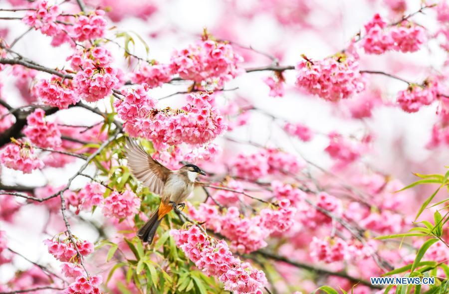 Photo taken on March 9, 2021 shows a bird flying amid cherry flowers in Guiyang, southwest China's Guizhou Province. (Xinhua/Yang Wenbin)