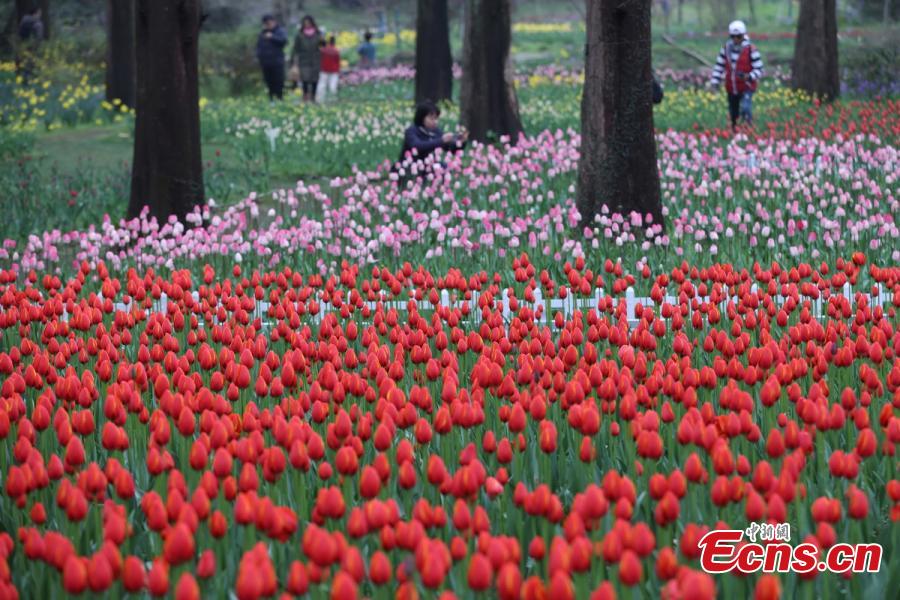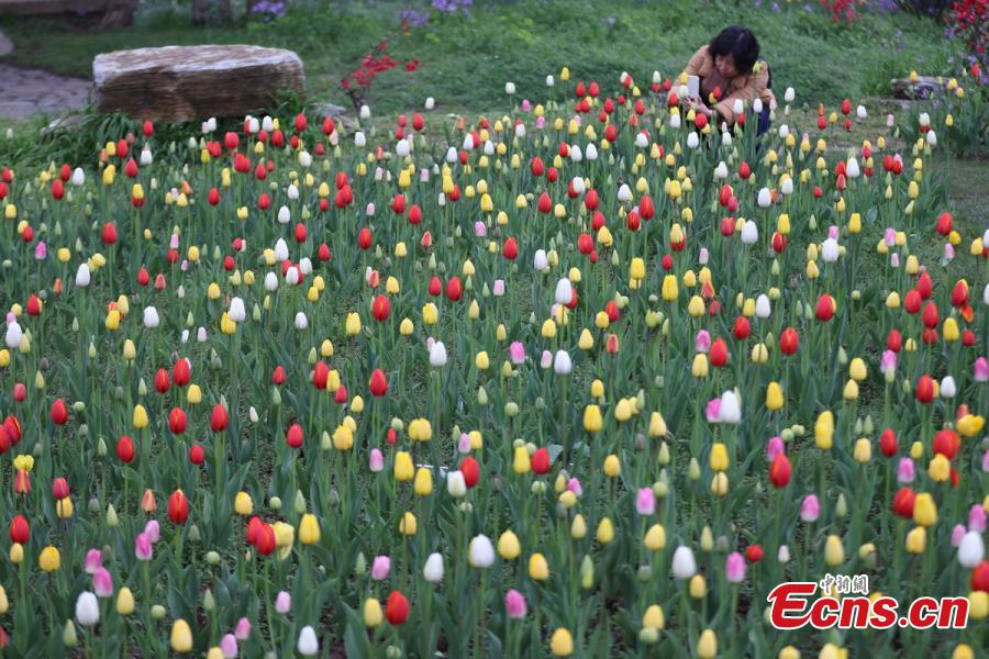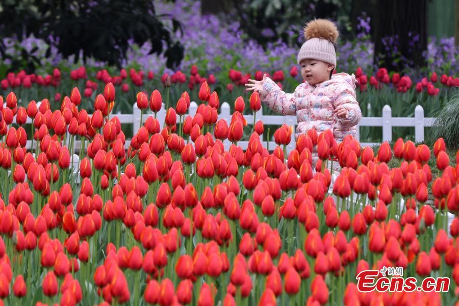 This photo taken on March 9, 2021 shows tulip bulbs are in bud at a park in east China’s Nanjing City, Jiangsu Province. (Photo: China News Service)