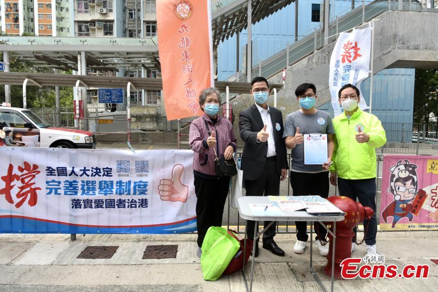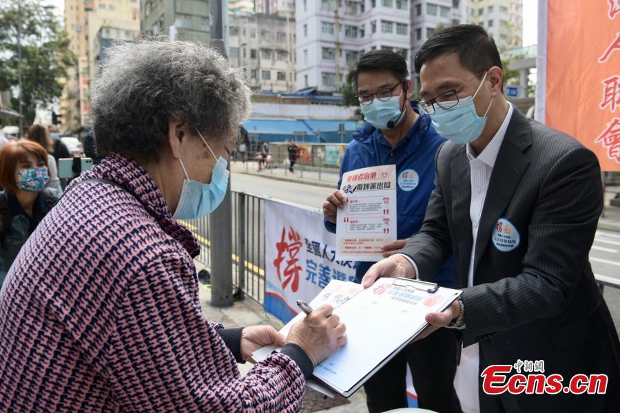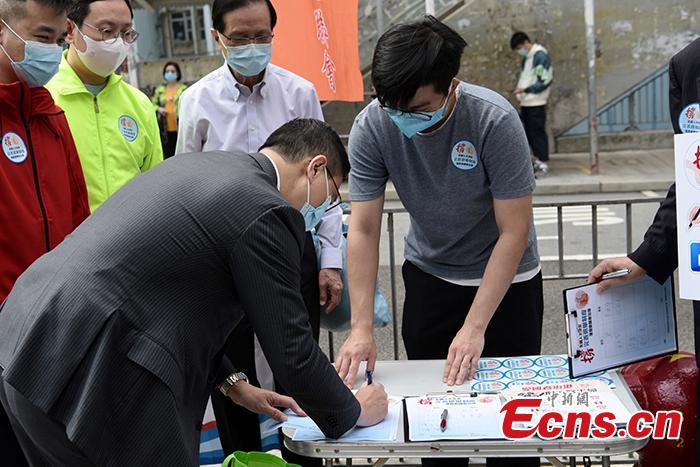 Kevin Yeung Yun-hung, Secretary for Education of Hong Kong Special Administrative Region (HKSAR), takes part in a signing event at a street stand in Tsz Wan Shan to support the improvement on HKSAR electoral system, March 11, 2021. A draft decision on improving the electoral system of the HKSAR has been submitted to China's top legislature on March 5 during its ongoing annual session. (China News Service/Li Zhihua)