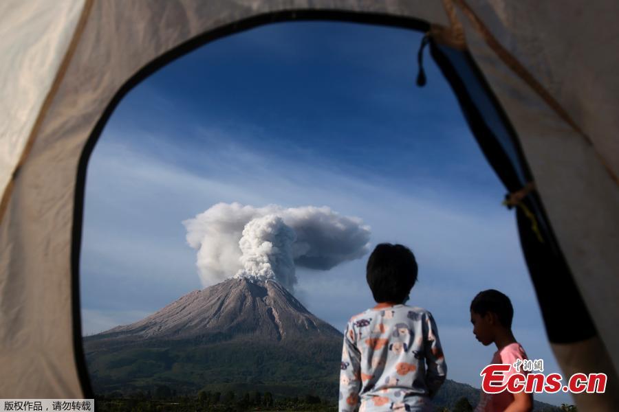 People look as ash spews from Mount Sinabung volcano during an eruption Tiga Pancur village in Karo, North Sumatra, Indonesia, March 11, 2021. (PhotoAgencies)