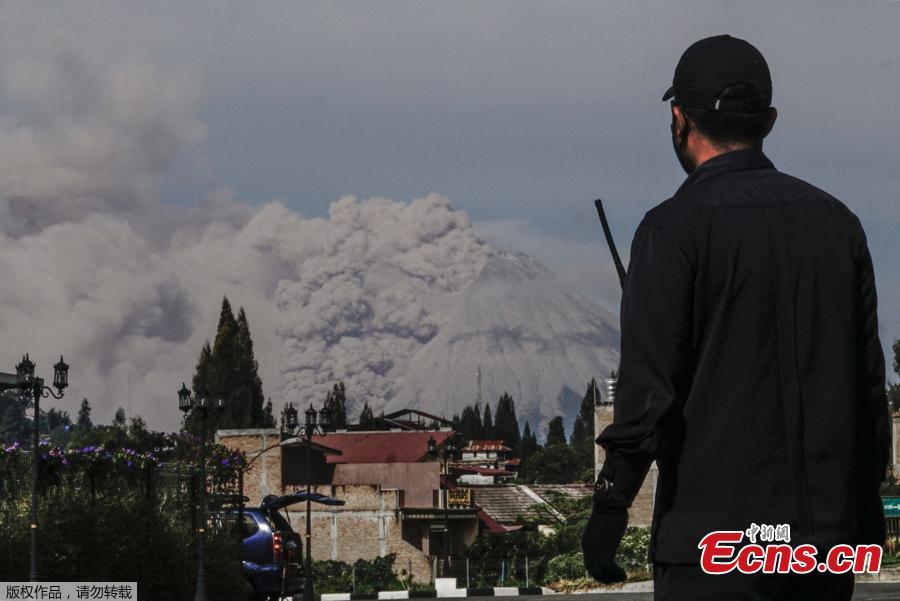 Photo taken on March 11, 2021 shows volcanic materials being spewed from Mount Sinabung, seen from Tiga Pancur village in Karo, North Sumatra, Indonesia. (PhotoAgencies)