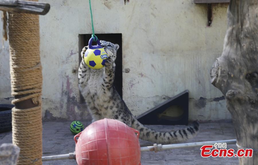 A snow leopard is attracted by the toy ball at the Qinghai-Tibet Plateau Wild Zoo in Xining, northwest China's Qinghai Province, March 11, 2021. Staffs in the Qinghai-Tibet Plateau Wild Zoo provided new toy balls and seesaws for snow leopards and manuls on Thursday. (Photo: China News Service/Ma Mingyan)