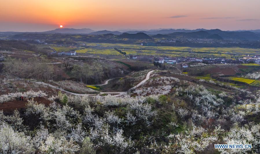 Aerial photo taken on March 13, 2021 shows blooming pear flowers in Hanzhong, northwest China's Shaanxi Province. (Xinhua/Tao Ming)
