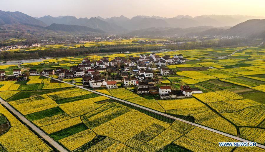 Aerial photo taken on March 11, 2021 shows the cole flower fields in Hanzhong, northwest China's Shaanxi Province. (Xinhua/Tao Ming)
