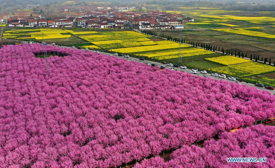 Aerial photo taken on March 11, 2021 shows visitors viewing flowers in Hanzhong, northwest China's Shaanxi Province. (Xinhua/Tao Ming)