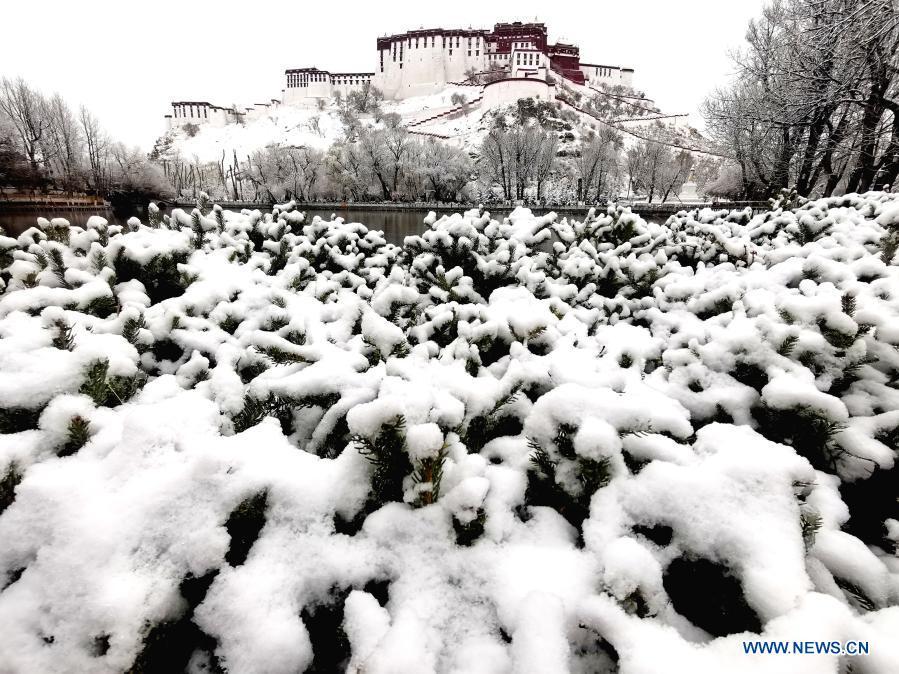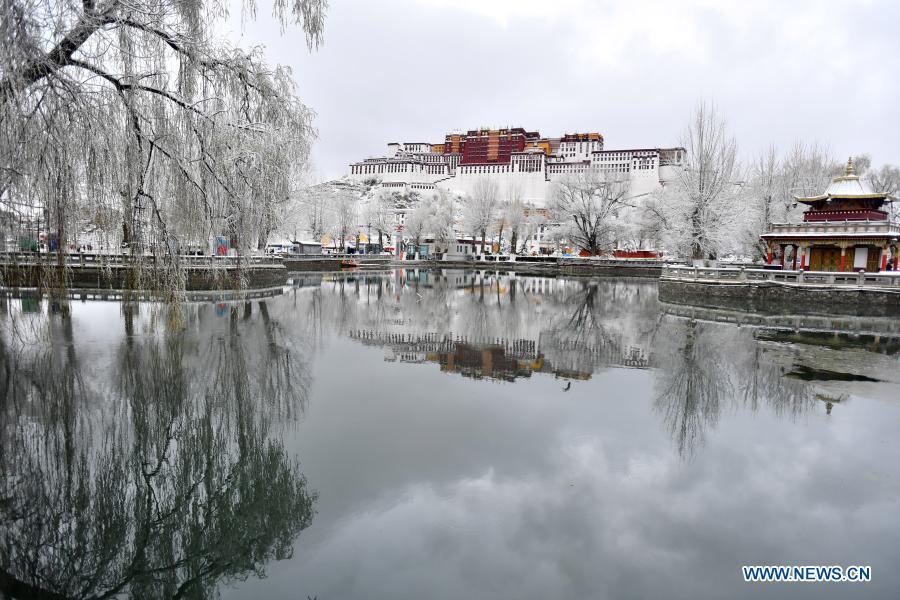 Photo taken on March 14, 2021 shows the snow scenery of Potala Palace in Lhasa, capital of southwest China's Tibet Autonomous Region. (Xinhua/Sun Ruibo)