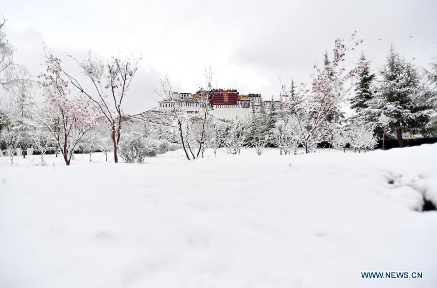 Photo taken on March 14, 2021 shows the snow scenery near the Potala Palace in Lhasa, capital of southwest China's Tibet Autonomous Region. (Xinhua/Chogo)