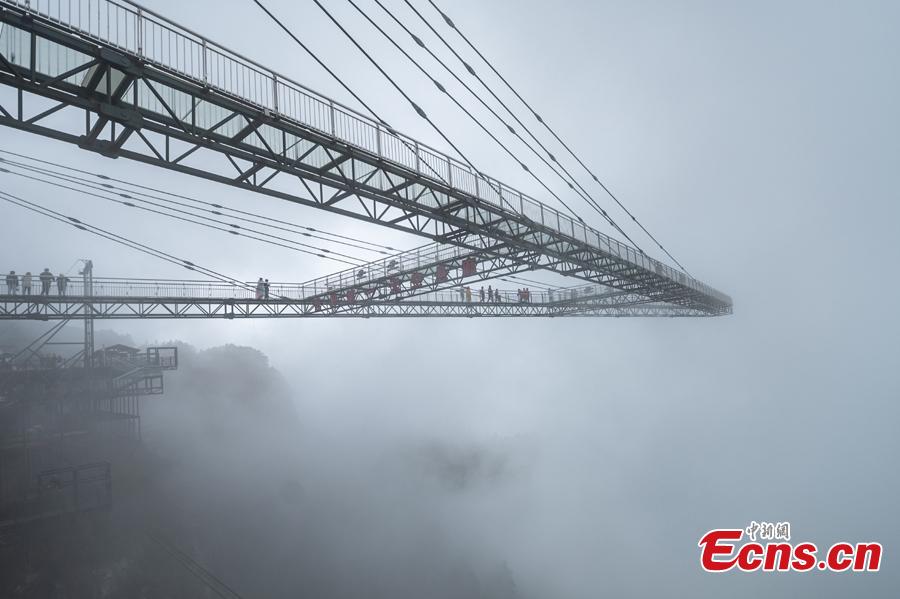 Visitors walk on the A-shaped skywalk in Wansheng Ordovician Park, Southwest China's Chongqing, March 16, 2021. (Photo: China News Service/He Penglei)