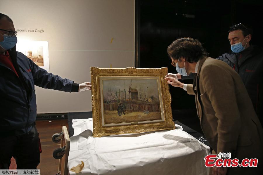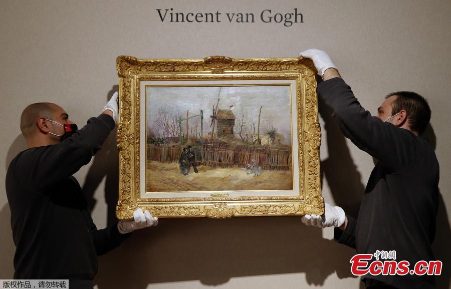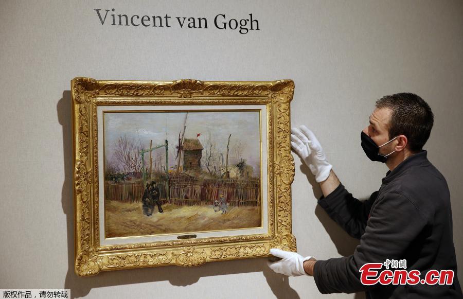 A photo taken on March 16, 2021 shows Vincent William van Gogh's 1887 Montmartre Street View, which was painted by Dutch post-impressionist painter Vincent van Gogh, at the Drouot auction house in Paris, France. The Sotheby's team will hold the online auction via video link in Paris, New York and Hong Kong. Given the rarity of the Montmartre collection, the painting is estimated to be worth between five and eight million euros. (Photo/VCG)