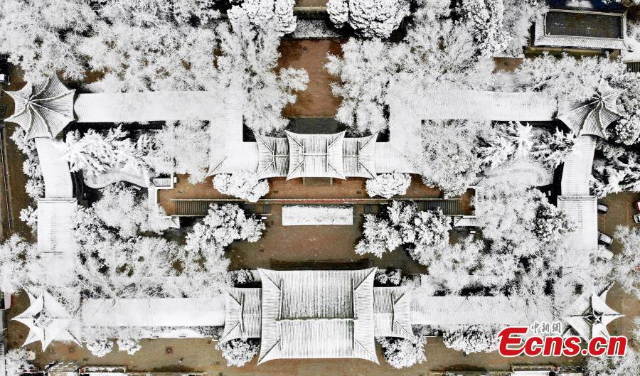 Aerial photo taken on March 19, 2021 shows the snow scenery of Baita Mountain in Lanzhou, Gansu Province. (Photo: China News Service/ Gao Zhan)