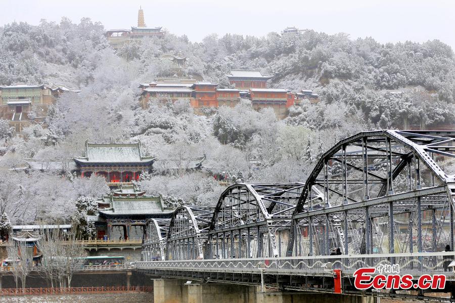Photo taken on March 19, 2021 shows the snow scenery of Lanzhou Zhongshan Bridge in Northwest China's Gansu Province. Spring snow falls in Lanzhou, the place that had suffered sandstorms for several days. (Photo: China News Service/ Gao Zhan)
